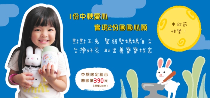 愛孩子小舖推出「限量中秋組合」,弱勢媽媽親手縫製的可愛玉兔寶寶,搭配由台灣好茶製成的寶寶造型茶包,以禮物袋包裝,成為最溫馨的中秋伴手禮!